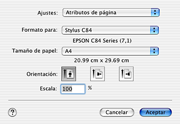 Puede configurar los ajustes que desee utilizar en la impresión de Impresora, Tamaño, Orientación y Escala.
