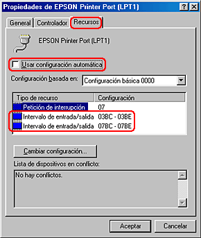 ![]() | Haga clic en la ficha Recursos y desactive la casilla de verificación Usar configuración automática. Escriba los ajustes del Intervalo de entrada/salida mostrado en el cuadro de configuración de recursos. |