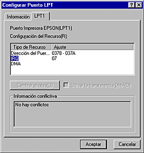 Si ha conectado la impresora a LPT2 o LPT3, los ajustes de IRQ y DMA pueden ayudar a aumentar la velocidad de impresión. Haga clic en Cambiar la configuración e introduzca los números de configuración para IRQ y DMA que figuran en la tarjeta de ampliación. Consulte la documentación del ordenador para determinar los ajustes de IRQ y DMA.