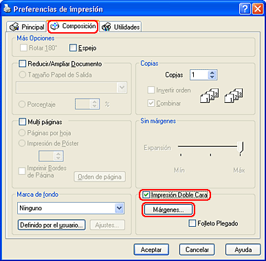 Haga clic en la ficha Composición y seleccione la casilla de verificación Impresión doble cara.