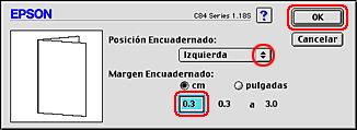 Especifique el ancho del margen del encuadernado en el cuadro de texto. Puede especificar cualquier anchura comprendida en el intervalo 0,12-1,18 pulg. o 0,3-3 cm.