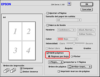 La impresión de Páginas por hoja le permite imprimir 2 ó 4 páginas en una única hoja de papel.