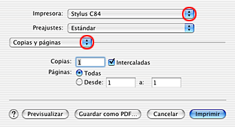 ![]() | Seleccione Stylus C84 como el ajuste de Impresora y defina los ajustes de Copias y páginas. |