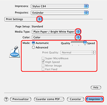 ![]() | Seleccione Stylus C84 como el ajuste de Impresora. |