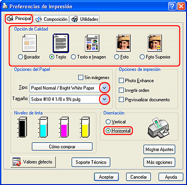 ![]() | Seleccione el tamaño de sobre adecuado en Tamaño papel. |