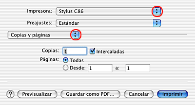 ![]() | Seleccione Stylus C86 como el ajuste de Impresora y defina los ajustes de Copias y páginas. |