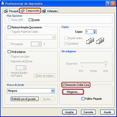 Haga clic en la ficha Composición y seleccione la casilla de verificación Impresión Doble Cara.