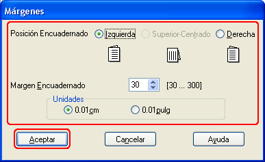 Elija entre cm o pulg. como el ajuste de Unidades. Especifique la anchura del margen de encuadernación.