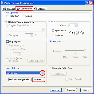 Haga clic en la ficha Composición, elija la marca de fondo deseada en la lista Marca de fondo y haga clic en Ajustes.