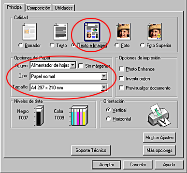 ![]() | Haga clic en la ficha Principal, seleccione Alimentador de hojas, Papel normal y A4 en Opciones del papel, y Texto e imagen en Calidad. |