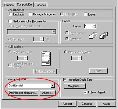 En Windows, elija la marca de fondo deseada en la lista Marca de fondo del menú Composición, y haga clic en Ajustes.