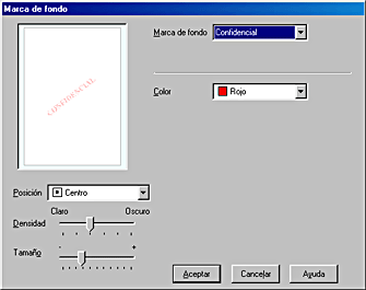 Especifique los ajustes deseados para la marca de fondo. Si desea modificar la posición y el tamaño de la marca de fondo, arrástrela en la ventana de previsualización de la izquierda.