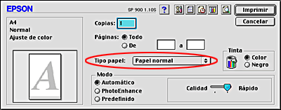 En Macintosh, seleccione el Tipo papel deseado en el cuadro de diálogo Imprimir, y luego seleccione el Tamaño papel deseado en el cuadro de diálogo Ajustar página.
