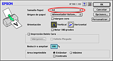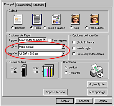 En Windows, seleccione el Tamaño y el Tipo deseados en Opciones del papel, dentro del menú Principal.