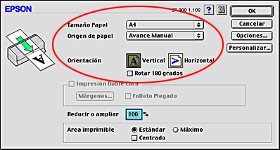 Seleccione el ajuste Avance manual de Origen de papel, el ajuste A4 de Tamaño papel, y el ajuste Vertical de Orientación.