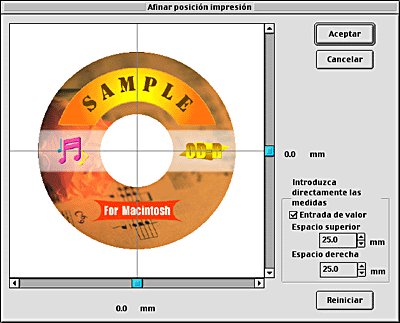 Si los ajustes Horizontal y Vertical de Ajustar posición impresión no están configurados como 0,0 mm, haga clic en Ajuste de la posición. Aparecerá el cuadro de diálogo Afinar posición impresión. Si el ajuste configurado es 0,0 mm, vaya al paso 11.