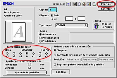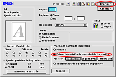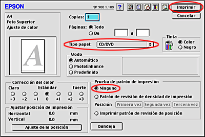 Seleccione el ajuste CD/DVD de Tipo papel, el ajuste Ninguno de Prueba de patrón de impresión, y haga clic en Imprimir.