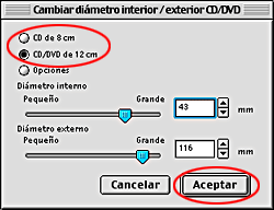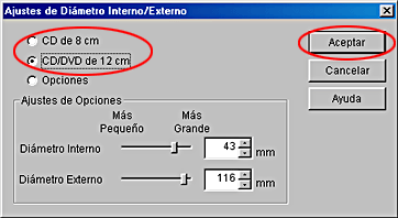 Seleccione CD de 8 cm o CD/DVD de 12 cm y haga clic en Aceptar.