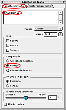 Si desea cambiar el estilo de los caracteres, haga clic en las fichas Ajustes de texto, Color de texto, Sombra y Distorsión del cuadro de diálogo Ajustes de texto. Los cambios realizados aparecerán en la zona de la etiqueta del cuadro de diálogo.
