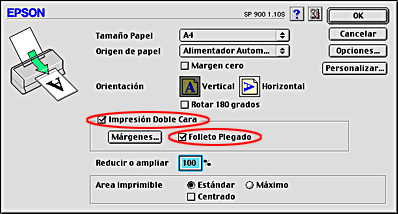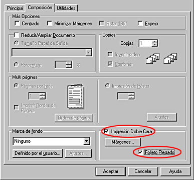 Seleccione la casilla de verificación Impresión doble cara en el menú Composición (en Windows) o en el cuadro de diálogo Ajustar página (en Macintosh). Después, seleccione la casilla de verificación Folleto plegado.