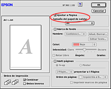 Seleccione el ajuste de Tamaño papel deseado para los datos de impresión originales en el cuadro de diálogo Ajustar página (Macintosh).