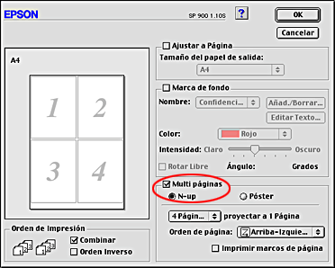 Configure los siguientes ajustes en impresión de Páginas por hoja.