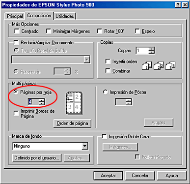 Seleccione el ajuste Páginas por hoja de Multi páginas en el menú Composición.
