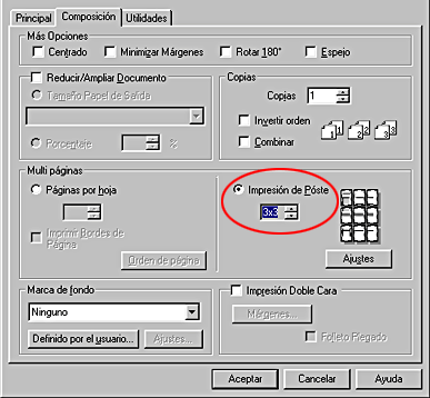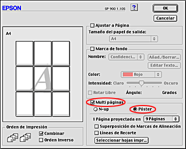 Seleccione la opción Impresión de póster de Multi páginas en el menú Composición. Después, haga clic en la flecha hacia arriba o hacia abajo para seleccionar 2x2, 3x3 ó 4x4.