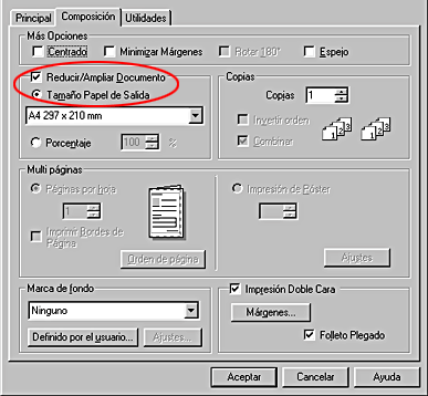 En el menú Composición, seleccione la casilla de verificación Reducir/Ampliar Documento y la opción Tamaño Papel de Salida.