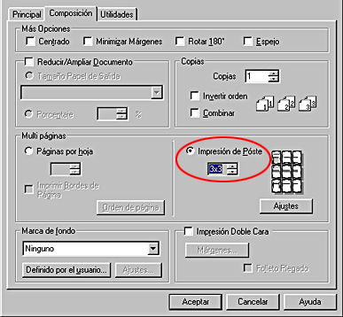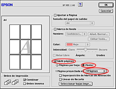 Seleccione la opción Impresión de Póster de Multi páginas en el menú Composición. Después, haga clic en la flecha hacia arriba o hacia abajo para seleccionar 2x2, 3x3 ó 4x4.