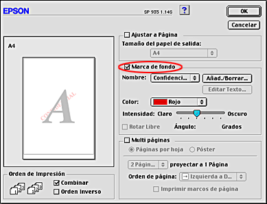 Especifique los ajustes deseados para la marca de fondo. Si desea modificar la posición y el tamaño de la marca de fondo, arrástrela en la ventana de previsualización de la izquierda.