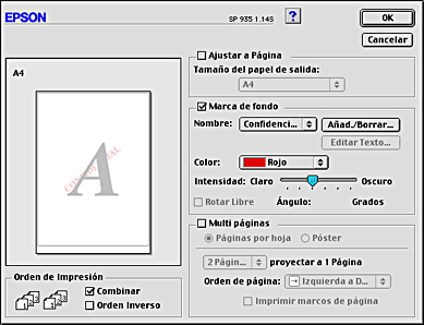 Esta función no está disponible si se ha seleccionado la casilla de verificación Sin márgenes bajo Opciones del Papel del menú Principal (en Windows) o en el cuadro de diálogo Imprimir (en Macintosh).