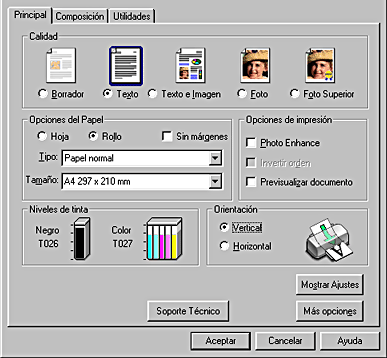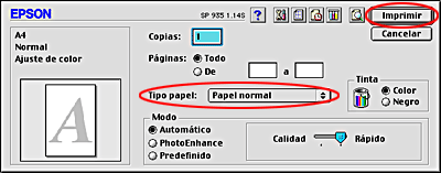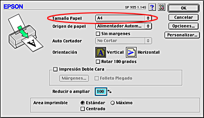 Cuando se haya cargado el rollo de papel en la impresora, compruebe que en el Selector está seleccionada la EPSON Stylus Photo 935 antes de continuar. Siga estos pasos para configurar el software de la impresora.