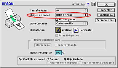 Seleccione Rollo de Papel como ajuste de Origen de papel.