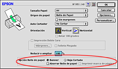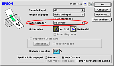 Defina los ajustes de Opción Rollo de Papel adecuados.