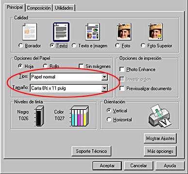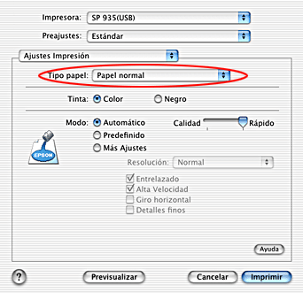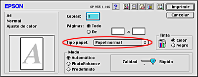 Seleccione el ajuste de Tipo papel en el cuadro de diálogo Imprimir.