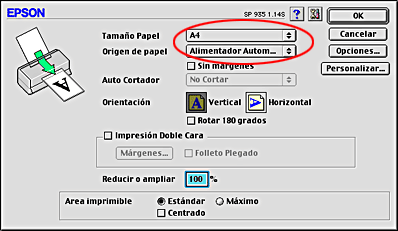 Seleccione el ajuste deseado de Tamaño Papel y Alimentador Automático como el ajuste de Origen de papel en el cuadro de diálogo Ajustar página.