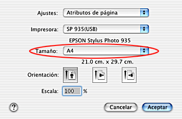 En el cuadro de diálogo Imprimir con Ajustes Impresión seleccionado, elija el ajuste deseado de Tipo papel. En el cuadro de diálogo Ajustar página, elija después el Tamaño deseado.