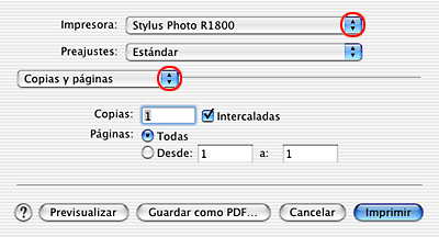 Seleccione Stylus Photo R1800 como el ajuste de Impresora y defina los ajustes de Copias y páginas.