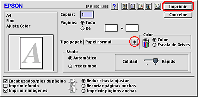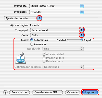 Seleccione Stylus Photo R1800 como el ajuste de Impresora.