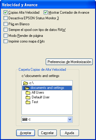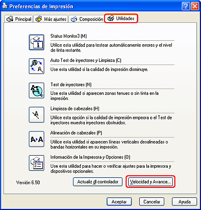 En el cuadro de diálogo Velocidad y Avance, puede definir ciertos ajustes para aumentar la velocidad de impresión. Haga clic en el botón Velocidad y Avance de la ventana Utilidades del controlador de impresora.