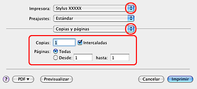 Seleccione la impresora que esté utilizando en Impresora y defina los ajustes de Copias y páginas.