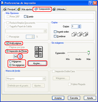 Para ajustar la forma en que va a imprimir el póster, haga clic en Ajustes. Se abrirá la ventana Ajustes del Póster.