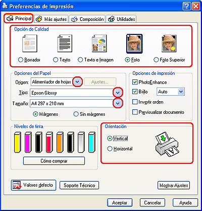 Haga clic en la ficha Principal y seleccione uno de los siguientes ajustes de Opción de Calidad: