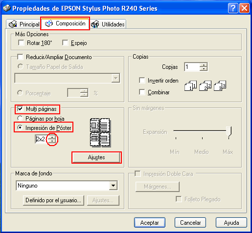 Haga clic en la ficha Composición, seleccione Multi páginas y luego Impresión de pósters. Haga clic en la flecha hacia arriba o hacia abajo para seleccionar 2x2, 3x3 ó 4x4.