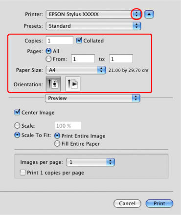 Esta es una función estándar de Mac OS X 10.4. Para utilizar esta función, seleccione siempre un tamaño de papel estándar (A4, por ejemplo) como ajuste de Paper Size (Tamaño papel) y configure la Scale (Escala) adecuada a ese ajuste. No seleccione un tamaño de papel con una opción de ajuste de página (por ejemplo: Sheet Feeder - Borderless (Alimentador de hojas - Sin márgenes)). Esta función no está disponible en Mac OS X 10.3 o anteriores.