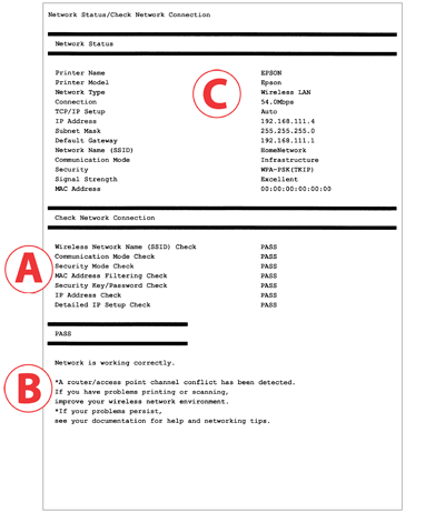 - Examine el informe Estado de la red/Comprobar conexión de red que acaba de imprimir. Fíjese en los elementos de A (Comprobar conexión de red) cuyo estado sea INCORRECTO.