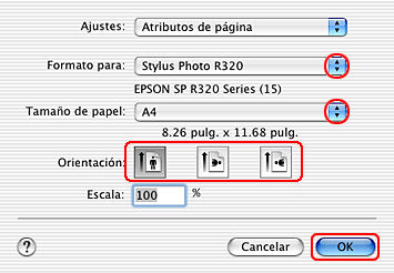 Configure los ajustes de Tamaño papel y Orientación adecuados.