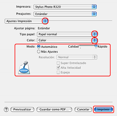 Configure los ajustes de Tipo papel, Color y Modo adecuados.