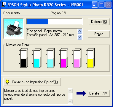 En el cuadro de texto situado en la parte inferior de la ventana del contador de avance, aparecen sugerencias para aprovechar al máximo el software de la impresora Epson. Cada 30 segundos se muestra un consejo nuevo. Si desea saber más sobre la sugerencia que aparece en pantalla, haga clic en el botón Detalles.
